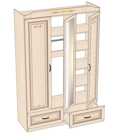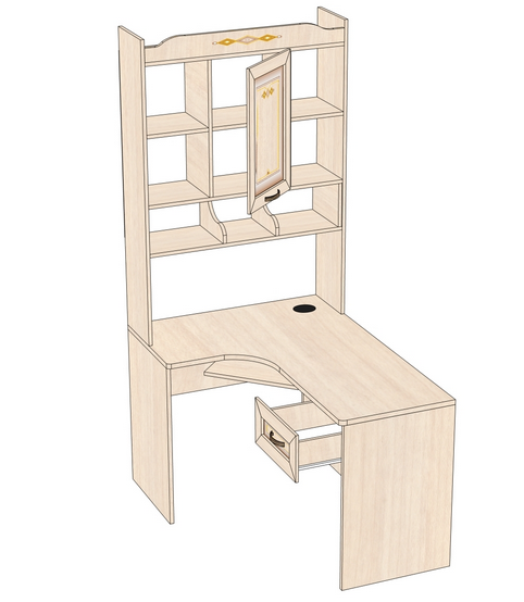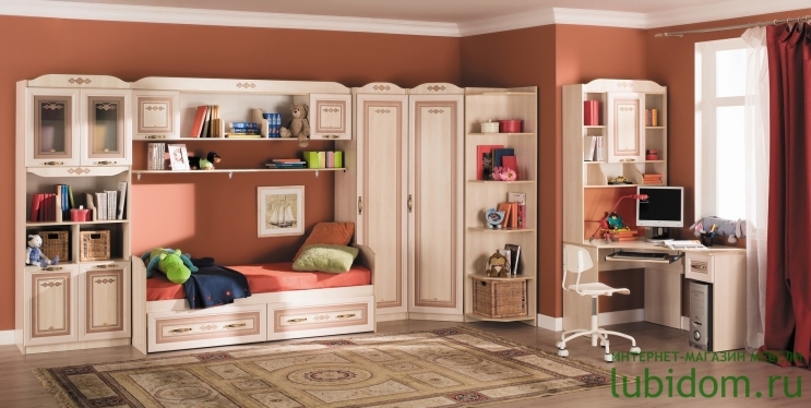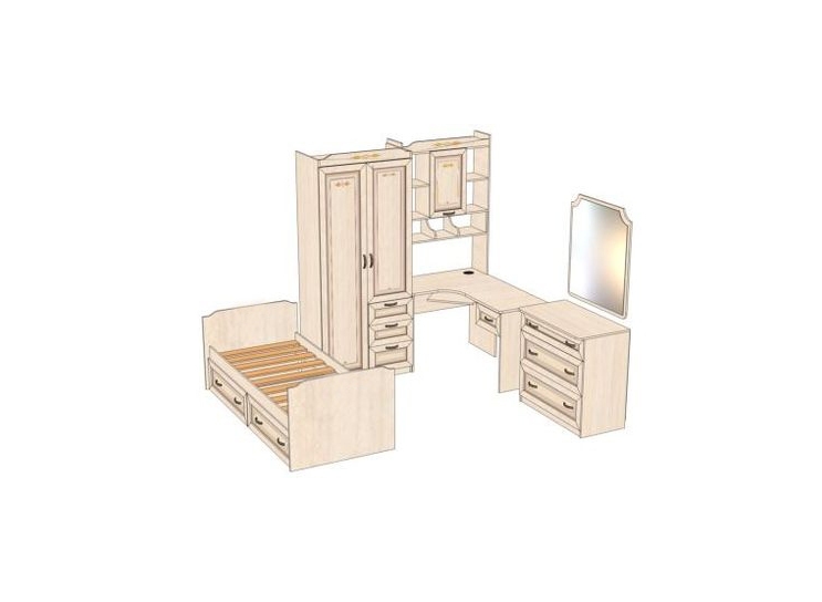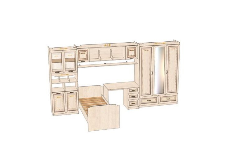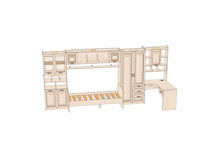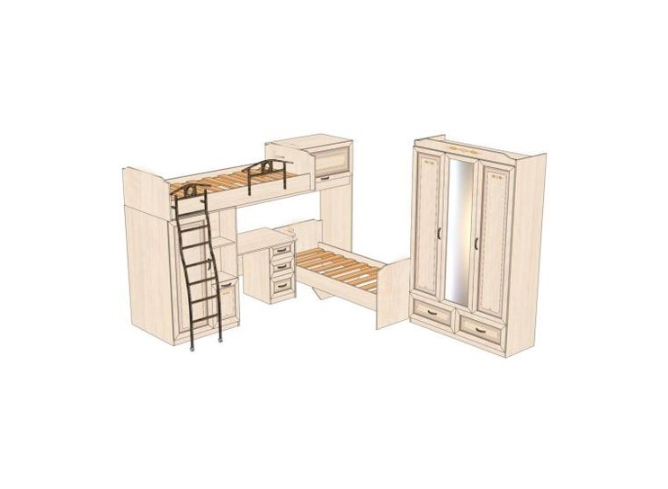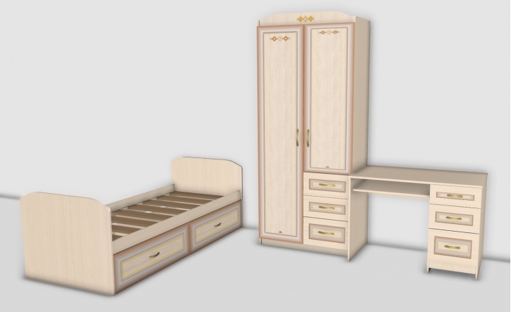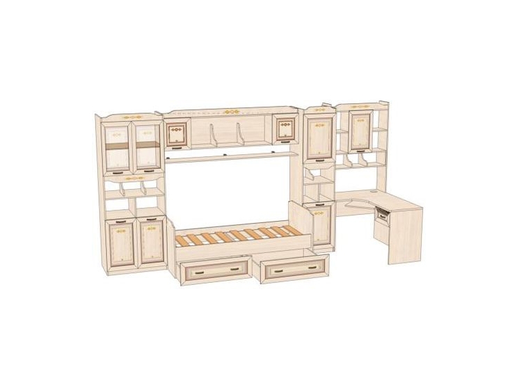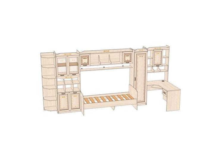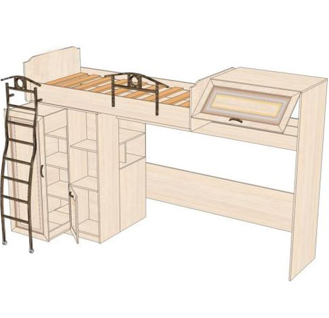 Функциональной изюминкой детской мебели «Аврора» выступает кровать. Она имеет проверенный годами конструктив, основа которого — популярные двухъярусные кровати предыдущих серий мебели для детских. В кровати предусмотрены стеллажи и ящики для книг и игрушек, выдвигающийся за лестницей мини-шкаф, внутри которого расположены штанга и полки для одежды.