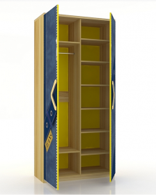 -за распашными дверьми справа ниша с 5 полками, слева - ниша с 2 полками и штангой для одежды