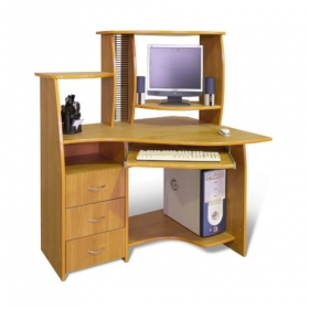 Угловой стол производится и правой, и левой конфигурации. КС-7 оснащен удобной полкой для принтера, поднятой над общей рабочей поверхностью стола. Под принтерную полку помещаются папки с документами или канцелярские принадлежности, что делает эксплуатацию стола более удобной. Дополнительной возможностью этой модели является то, что на КС-7 можно разместить и жидкокристаллический и ЭЛТ-Мониторы. Полка под монитор, на которой можно разместить и колонки, поднята над поверхностью стола, что увеличивает его рабочую площадь. Полка, расположенная над монитором, значительно расширяет функциональные возможности этой модели компьютерных столов. КС-7 оснащен СД-архивом для дисков, а также тумбой с тремя ящиками и нишей для бумаг. Выкатная полка под клавиатуру закреплена с помощью шариковых направляющих, которые фиксируют ее в рабочем положении. Нижняя полка позволяет поместить системный блок во внутреннем пространстве стола.