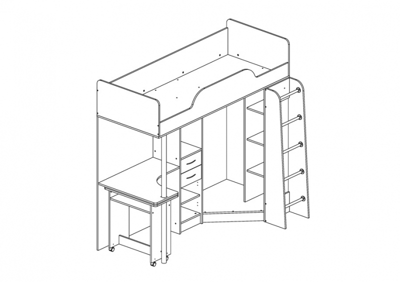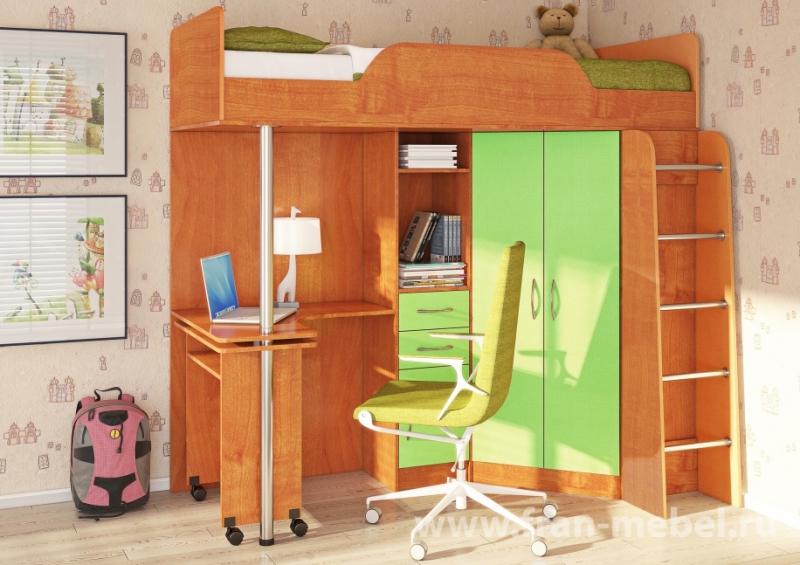 Универсальное решение для небольшой детской комнаты. Удобная кровать с местом под матрас размером 800 х 2000 мм. Рабочая зона с угловым компьютерным столом и дополнительной выдвижной стойкой на колесиках. Вместительный угловой шкаф поможет спрятать огромное количество вещей. На открытых полках можно расположить учебники. Выдвижные ящики отлично подойдут для канцелярских принадлежностей. Выполняется из высококачественной австрийской ЛДСП. Корпус в цвете — ольха, фасады в цвете — зелёный. Данный вариант со шкафом справа.