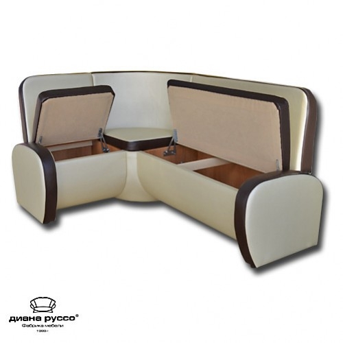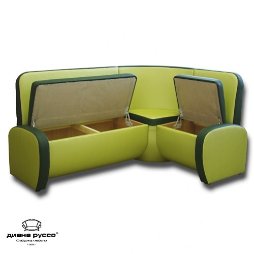 Каркас изделия изготовлен из реек древесины сосны, древесноволокнистой плиты, древесностружечной плиты толщиной 16мм, ламинированной древесностружечной плиты. Изделие состоит из угловой секции и 2х диванов. Угловая полка выполнены из древесноволокнистой плиты средней плотности (МДФ). Сидения диванов откидные, установлены на микролифты.
