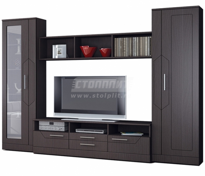 Строгая и стильная стенка для гостиной. Дизайн стенки продуман до мелочей: она состоит из двух шкафов с матовой стеклянной дверцей, четырех ящиков и удобной ниши для ТВ. Цвет стенки — «дуб Феррара». Стенка Лас-Вегас — это модернизированное предложение от компании Столплит. Строгий дизайн гарнитура непременно вам понравится , если вы стремитесь оформить свою гостиную просто и со вкусом. Стенка сможет разместиться даже в небольшой комнате, ведь ее длина немногим больше трех метров.
