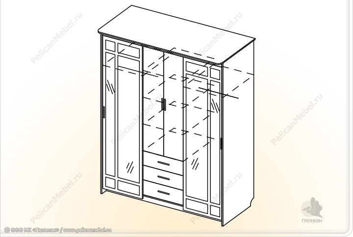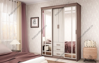 Современный комбинированный шкаф-купе с зеркалами, распашной секцией и выдвижными ящиками.