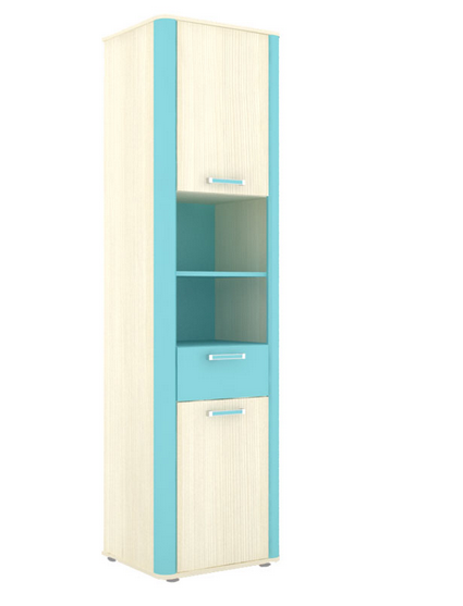 За распашными дверьми пенала находятся полки. По центру расположен вместительный выкатной ящик на шариковых направляющих. Элемент предусматривает сборку на правую и левую стороны.